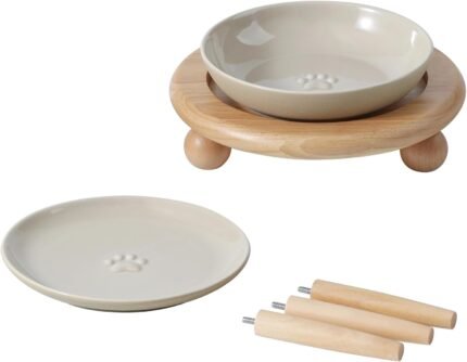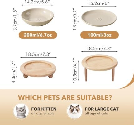 Raised Ceramic Wide Whisker Friendly Cat Dishes, Food&Water Bowl with 2 Style Stand Adjustable Pet Bowl Set(1Dish+1Shallow Dish+Stand