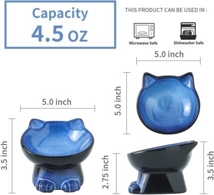 Slanted Elevated Cat Bowls: 5 Inch Ceramic Raised Cat Food Bowl for Protecting Pet’s Spine – Microwave & Dishwasher Safe -Elegant Blue & Black (4.5 OZ /1 PC)