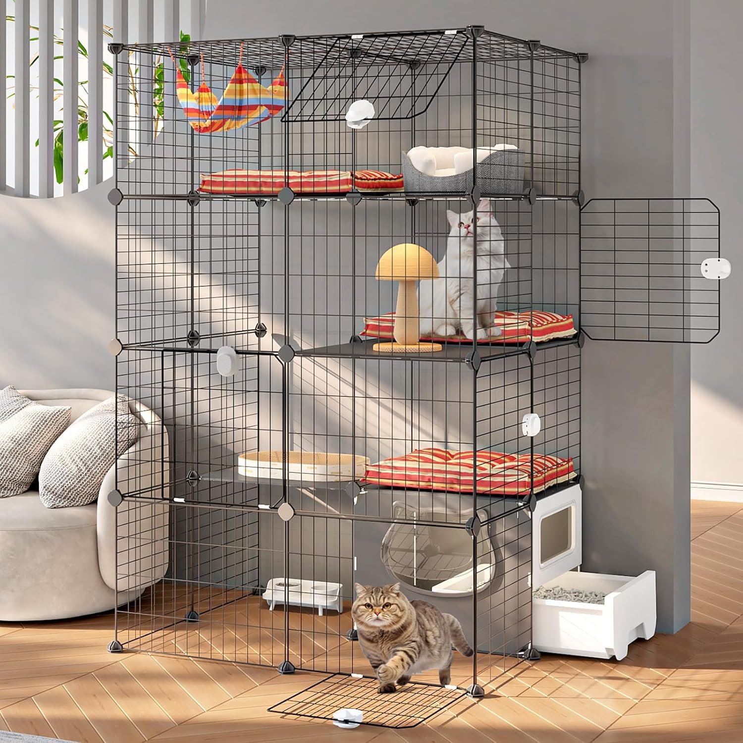 Cat Cage with Litter Box, 4-Tier DIY Enclosures Detachable Metal Wire Kennel Indoor Crate Large Exercise Place Ideal for 1-2 Cats